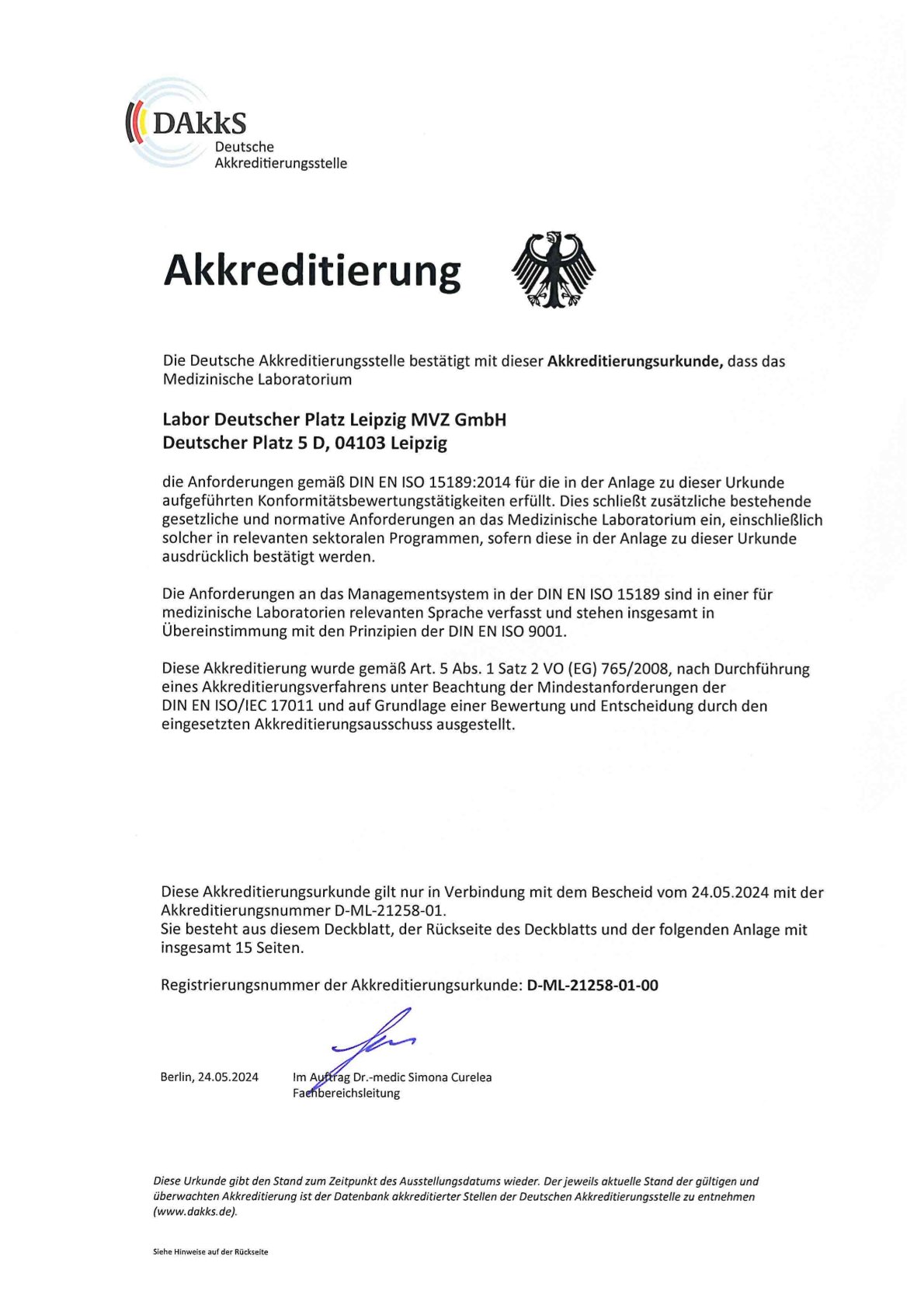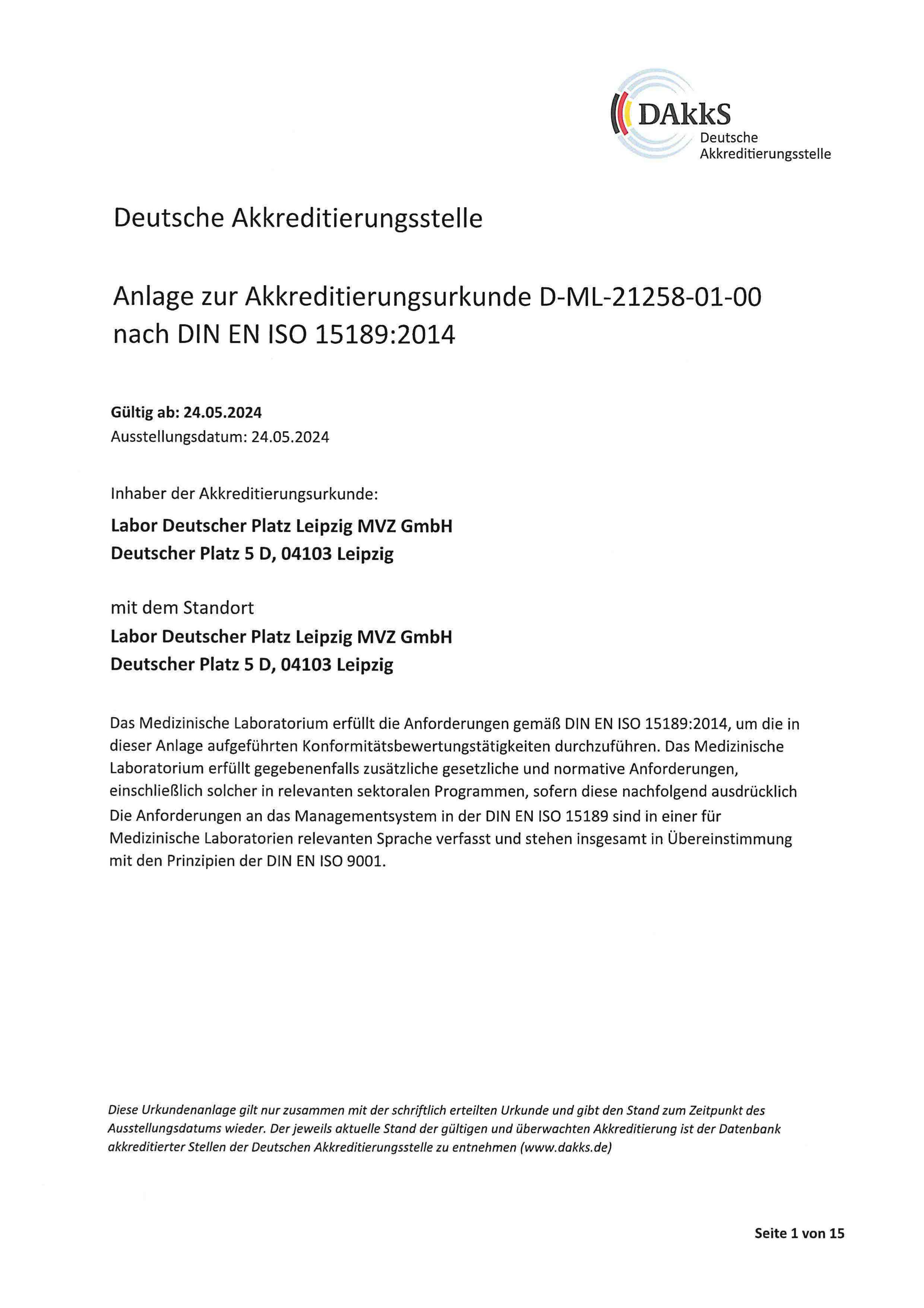 Seit 2019 ist unser Labor für medizinische Laboratorien nach der DIN EN ISO 15189 durch die Deutsche Akkreditierungsstelle (DAkkS) akkreditiert.